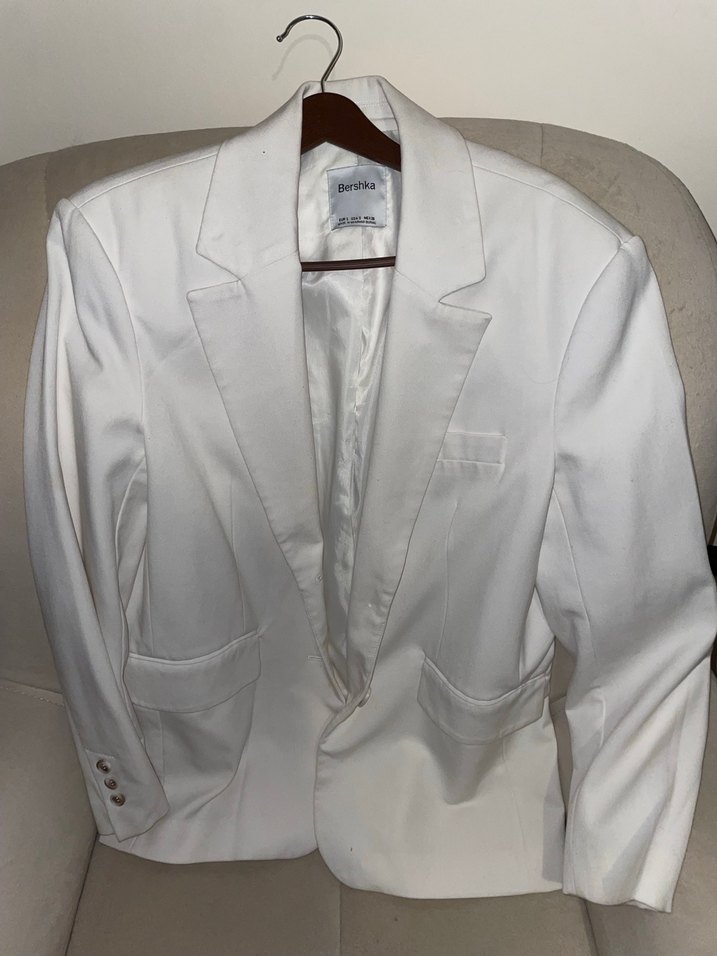 Beyaz keten kumaştan, düğmeli ve kesik yakalı kadın blazer ceket. Uzun kollu, normal kesim ve midi boy, ofis ve günlük kullanıma uygun.