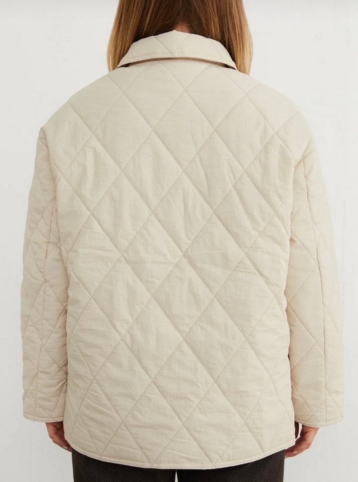 Beyaz keten kumaştan, düğmeli ve notched lapel yakalı kadın ceketi. Uzun kollu, normal midi boyunda, sade ve minimalist tasarımlı, günlük kullanıma uygun.