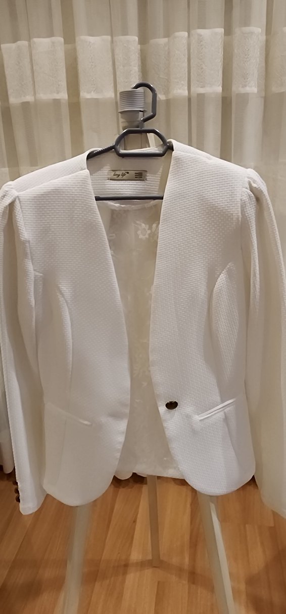 Beyaz renkli, keten kumaştan yapılmış, uzun kollu ve düğmeli kadın blazer ceket. Klasik modern tarzda, ofis için uygun, normal boy ve rahat kesim.