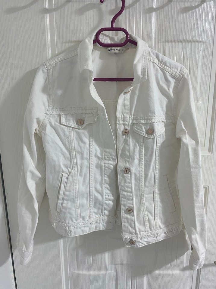 Beyaz kot ceket, düğmeli ve fitted kesimdir. Notlu yaka ve uzun kolludur. Pamuklu kumaştan, günlük kullanıma uygundur.