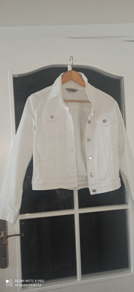 Beyaz kot ceket, düğmeli, kesik yaka ve uzun kollu. Normal kesim ve günlük rahat kullanım için uygundur.