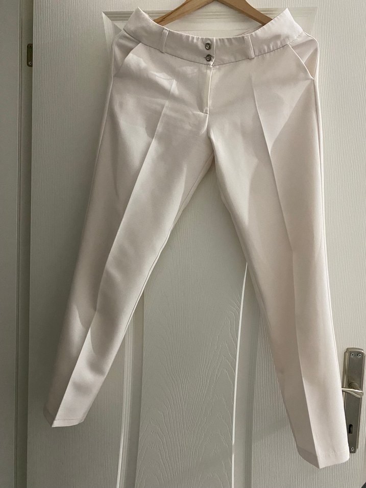 Beyaz, ipeksi kumaştan kadın pantolonu, normal kesim ve midi boyda, düğme detaylı, ofis kullanımı için uygundur. 40 beden 95 cm boyu çok az kullanıldı