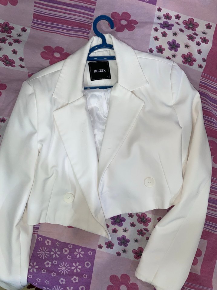 Beyaz renginde, düğmeli ve kesik yaka detaylı, uzun kollu kadın midi blazer. Sentetik kumaştan, rahat kesimle ofis ve günlük kullanıma uygun.