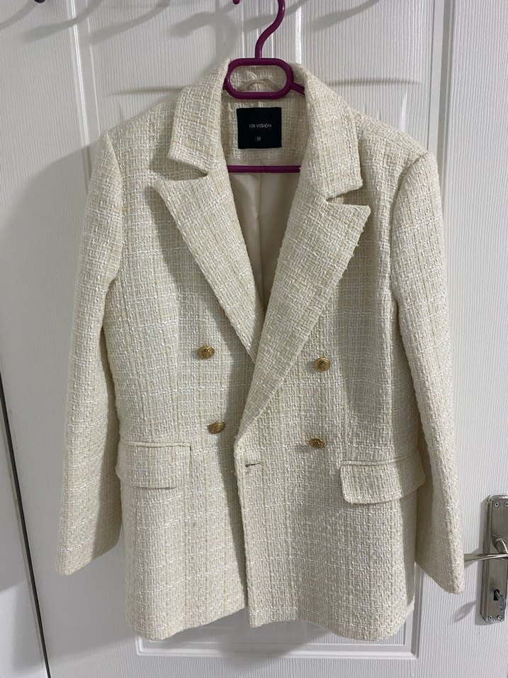 Beyaz renkli, düğmeli, notched lapel yakalı kadın blazer. Sentetik dokulu kumaştan, midi boyda, uzun kollu, modern klasik tarzda, ofis kullanımı için uygun.