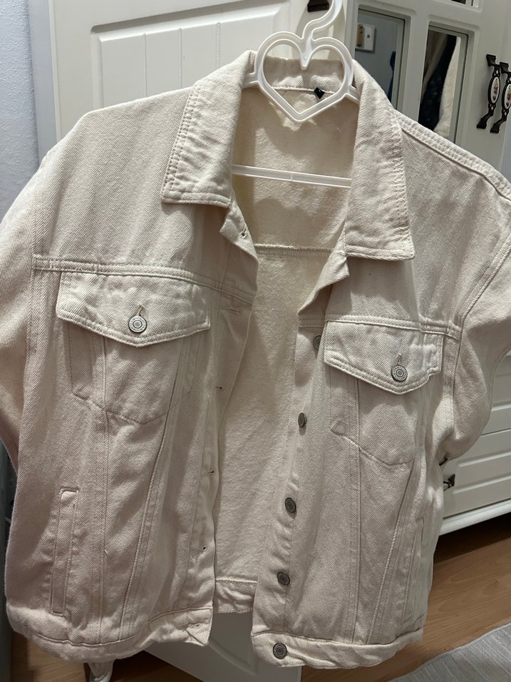 Kadınlar için beyaz düğmeli, bol kesim ve yaka detaylı midi uzunlukta kot ceket. kısa kollu ve keten kumaştan üretilmiştir, günlük rahat kullanım için uygundur.