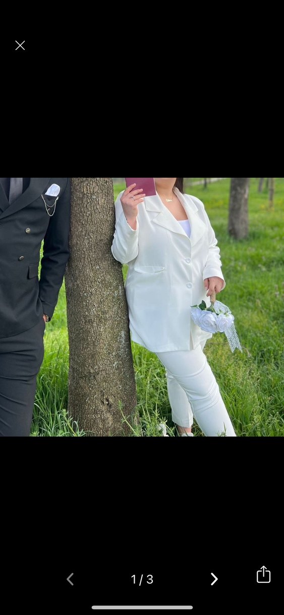 Beyaz, düğmeli, uzun kollu kadın midi takım elbise. Notched lapel yakaya sahip, normal kesim ve sentetik kumaştan üretilmiştir.