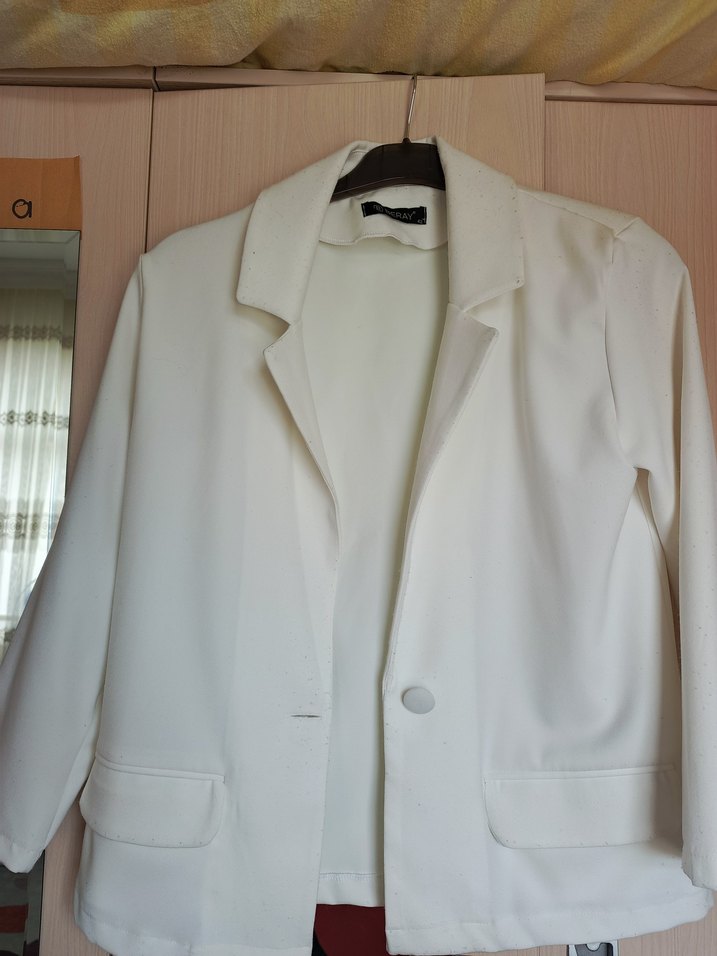 Beyaz, düğmeli, normal kesim kadın ofis ceketi, yakası kesimli, uzun kollu, parlak ve ipeksi dokulu kumaştan.
