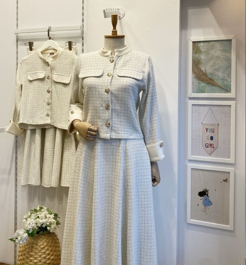 Pamuk kumaştan yapılmış, uzun kesim beyaz kadın ofis tüvit takımı. Düğmeli, uzun kollu, işlemeli ve klasik zarafeti yansıtan bir tasarım. Pastel tonlarda şık detaylar içerir. ✨ Yakından fotoğraf atabilirim