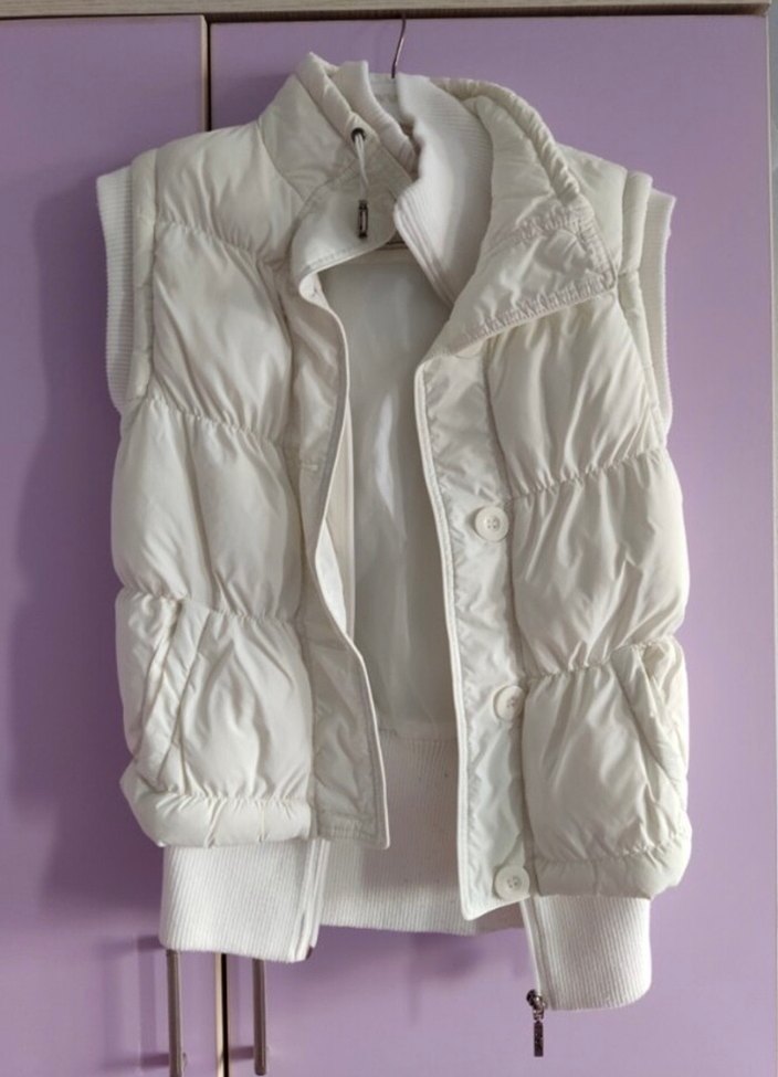 Beyaz sleeveless yelek, yüksek yakalı ve düğmeli önde. Fitted, midi boyda, yumuşak ve rahat kumaştan, gündelik street wear için uygun.