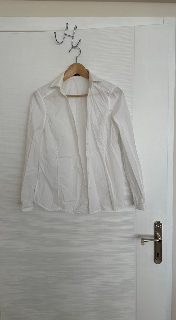 Beyaz, düğmeli, keten kumaştan, uzun kollu, yakalı ve fitted kesim gömlek. Ofis ve sokak stiline uygun parlak görünüme sahip.