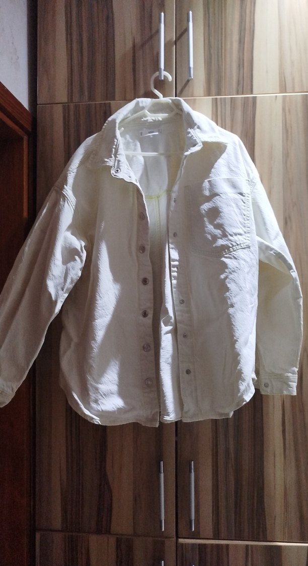 Beyaz keten gömlek, düğmeli ön, uzun kollu ve kesik yaka detayına sahiptir. Salaş kesim ve midi boyda, minimalist sokak stili için uygundur. Günlük kullanıma idealdir.