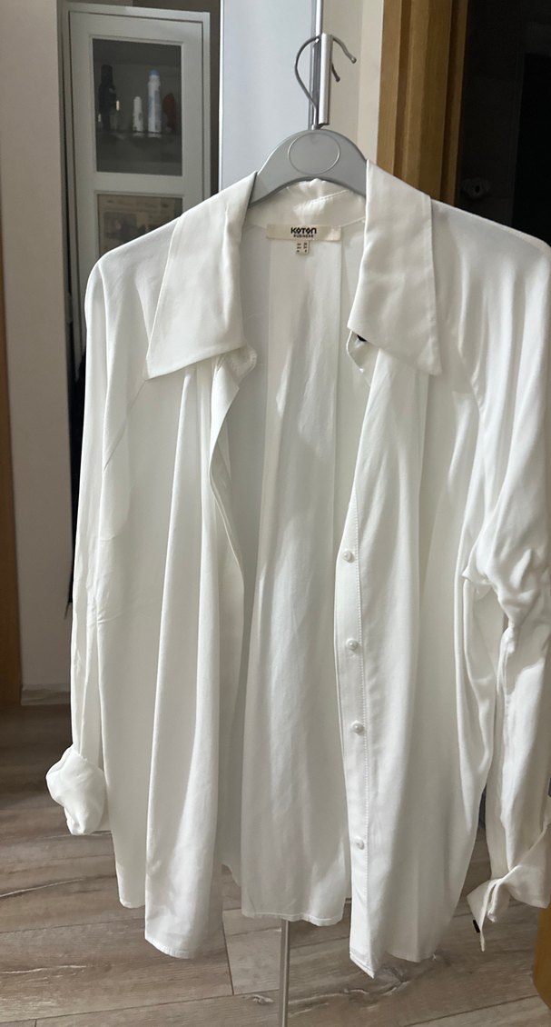 Beyaz keten kumaştan, düğmeli ve yakalı kadın gömleği. Uzun kollu, normal boyda ve bol kesimdir. Ofis kullanımı için uygundur ve parlak, sade tasarıma sahiptir.