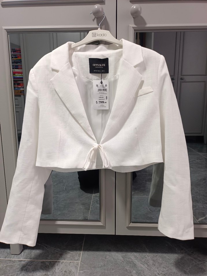 Beyaz keten mini blazer, düğmeli ve kesik yaka detaylı. Regular fit ve askılı kollu, ofis ve sokak stiline uygun.Hiç giyilmedi etiketi üsütnde bana büyük geldiği için satıyorum.