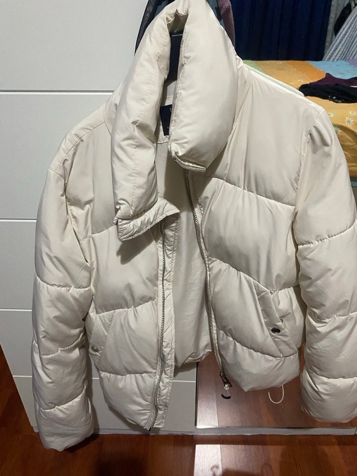 Beyaz renkte, düğmeli ve yüksek yakalı kısa kadın kışlık mont. Uzun kollu ve rahat kesimiyle günlük kullanıma uygundur. ❄️s ve m bedene de olur