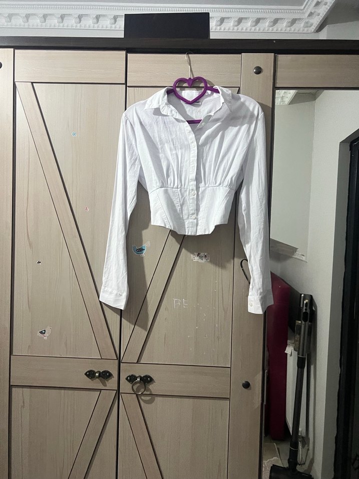 Pamuk kumaştan, beyaz, uzun kollu, düğmeli, kısa kesim ve yakalı kadın gömleği Sadece bir düğmesi yok 1 defa kullanıldı