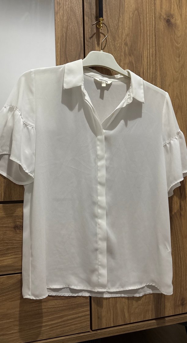 Beyaz, kısa kollu, yakalı ve düğmeli gömlek. Rahat kesimli ve parlak görünümlü, günlük kullanıma uygun.