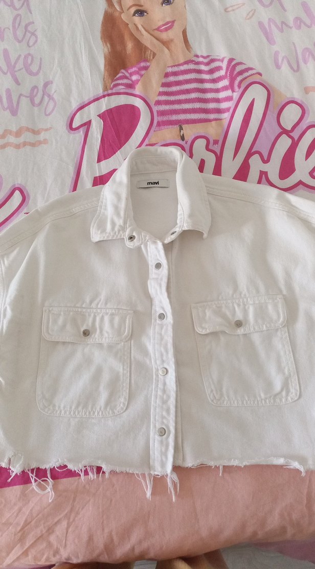 Pamuk beyaz kot ceket, düğmeli, uzun kollu yakalı. Rahat kesim ve normal boyda, baskılı desenli, gündelik sokak stili için uygun. ✨