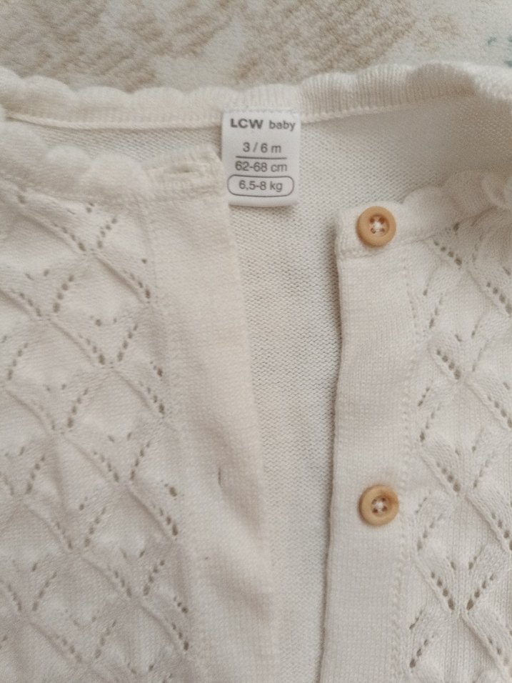 LCW Baby 3-6 ay, beyaz düğmeli kız bebek hırka. Uzun kollu, yuvarlak yakalı, örme kumaştan, rahat kesim.