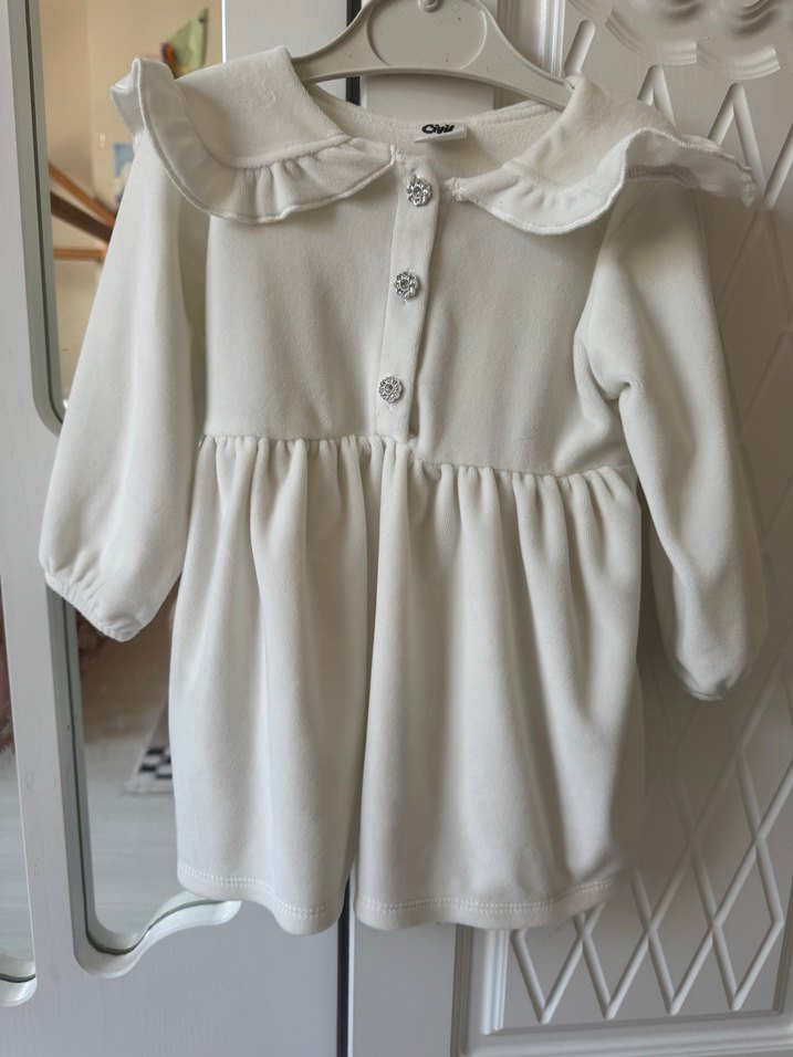 Beyaz renkli, uzun kollu, düğmeli ve fırfırlı yakalı kız çocuk elbisesi. Rahat kesimli ve yumuşak, sıcak kumaştan üretilmiştir.