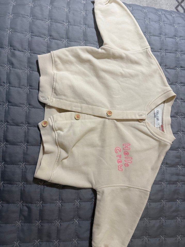 Uzun kollu, düğmeli, beyaz renkli bol kesim kız çocuk hırkası. Yumuşak ve sıcak kumaştan, pastel baskılı detaylı. "Hello" yazısı bulunur.