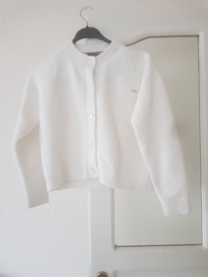 Beyaz, düğmeli ön kısmı ve uzun kollu, yumuşak ve sıcak dokulu kumaştan yapılmış kız çocuk hırkası. Salaş kesimi ve sade deseniyle günlük kullanıma uygundur. ❄️