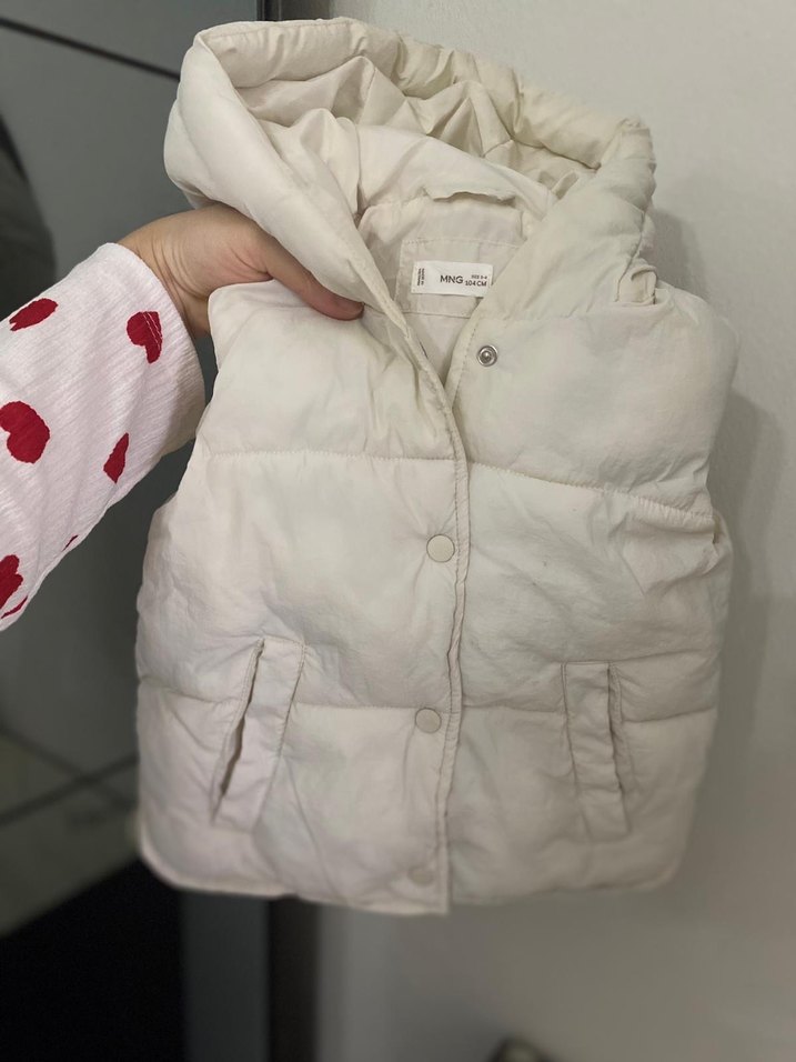 Mango Orjinal Beyaz renkli, düğmeli, pamuk kumaştan yapılmış kız çocuk şişme yelek. Kolsuz, çentikli yaka ve fitted kesimle sokak stiline uygun, sade ve pastel görünümlü.