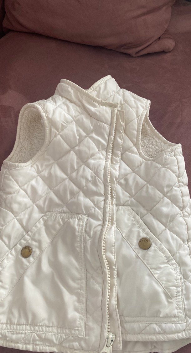 Düğmeli, yakalı ve kolsuz beyaz kız çocuk yeleği. Dışı kapitone, içi yumuşak ve sıcak dokulu kumaş. Sokak stili için uygun.