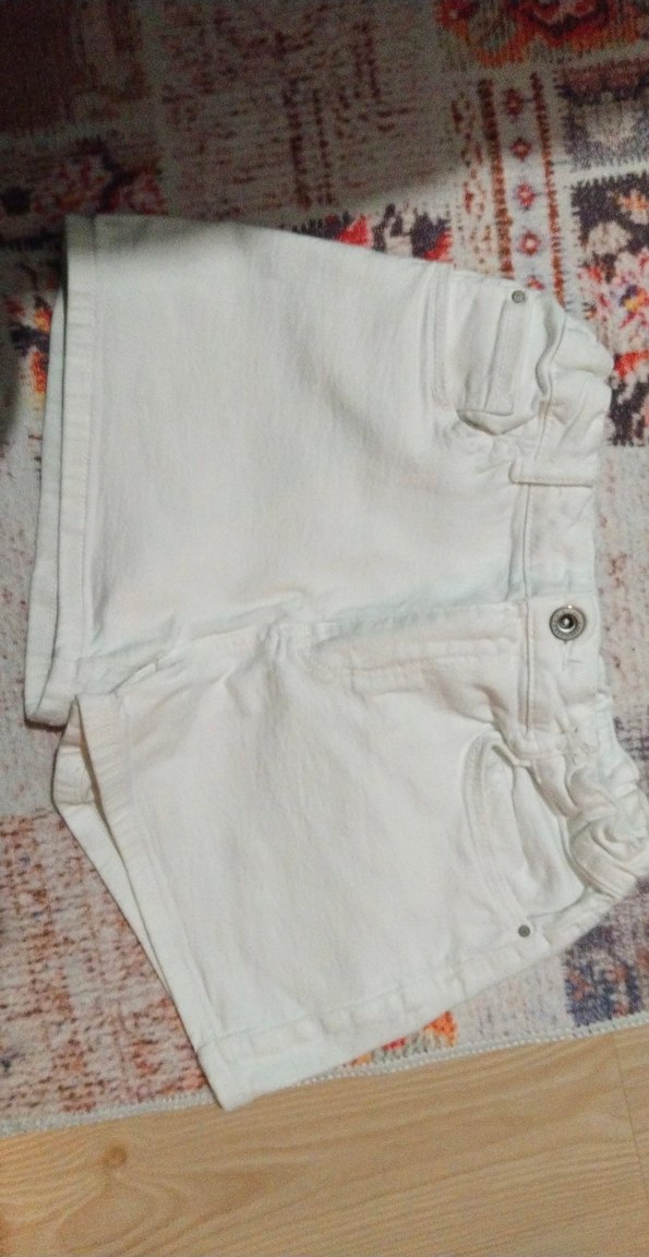 Beyaz pamuklu, düğmeli ve bol kesim kız şortu. Trendy casual sokak stili için hafif ve desensiz tasarım.