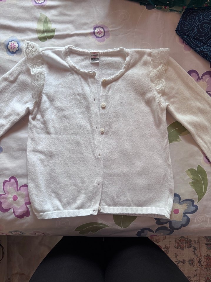 Beyaz renkli, düğmeli kız triko hırka. Uzun kollu, bol kesim ve omuzlarda dantel detaylı, bohem tarzda bir üründür.