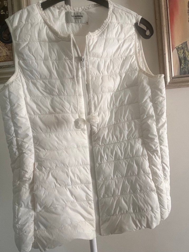 Yüksek yakalı, düğmeli beyaz kolsuz yelek. Yumuşak keten kumaştan, bol kesim ve midi boyda, günlük kullanıma uygun.