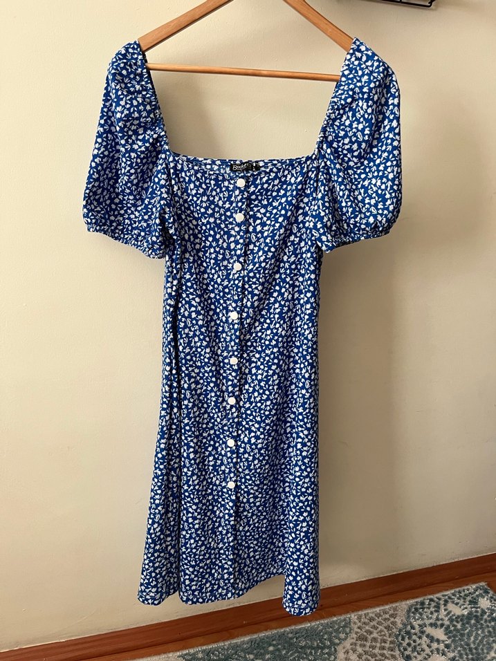 Pamuk kumaştan, düğmeli, kısa balon kollu, V yakalı, bol kesim mavi midi elbise. Esnek kumaşa sahiptir.