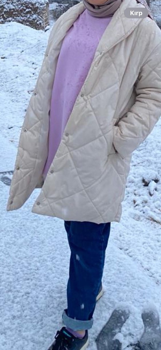 Beyaz renkli, düğmeli ve kesik yakalı, yumuşak ve sıcak kumaştan midi kadın kışlık ceket. Uzun kollu, rahat kesim ve günlük sokak stili için uygundur. ❄️