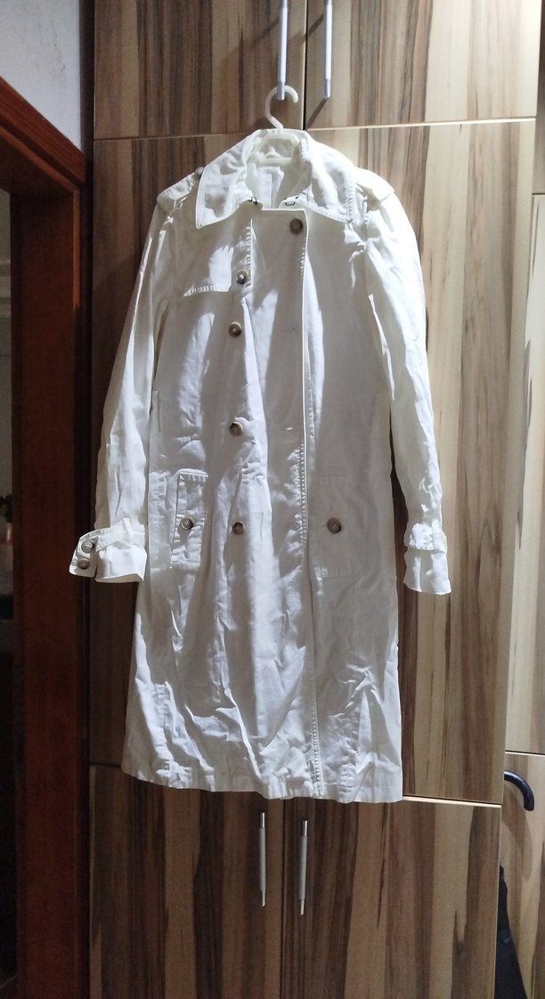 Beyaz keten kumaştan, düğmeli, uzun kollu midi boy trençkot. Salaş kesimi ve Paris tarzı ile günlük kullanıma uygun.