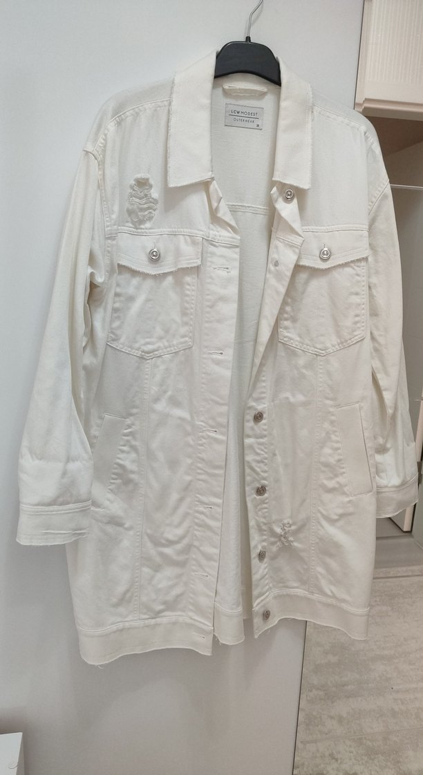 Pamuklu, uzun kollu, düğmeli beyaz kot ceket. Rahat kesimi ve cep detaylarıyla günlük sokak stiline uygun bir parça.