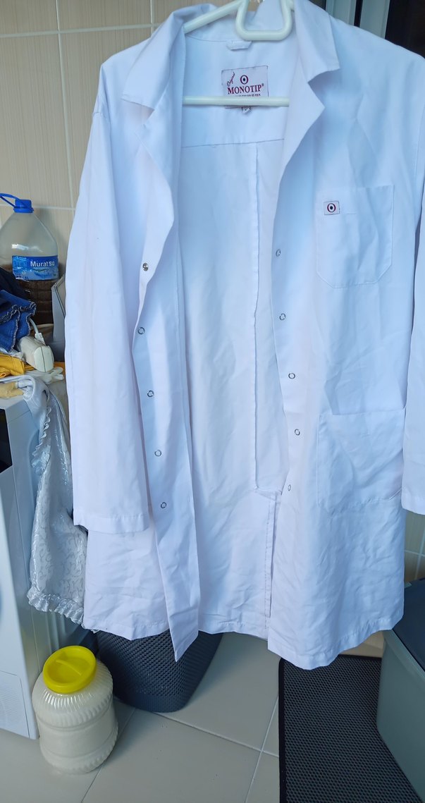 Beyaz, midi boy, uzun kollu önlük . Düğmeli ve düz kesim, yumuşak sentetik kumaştan üretilmiştir.