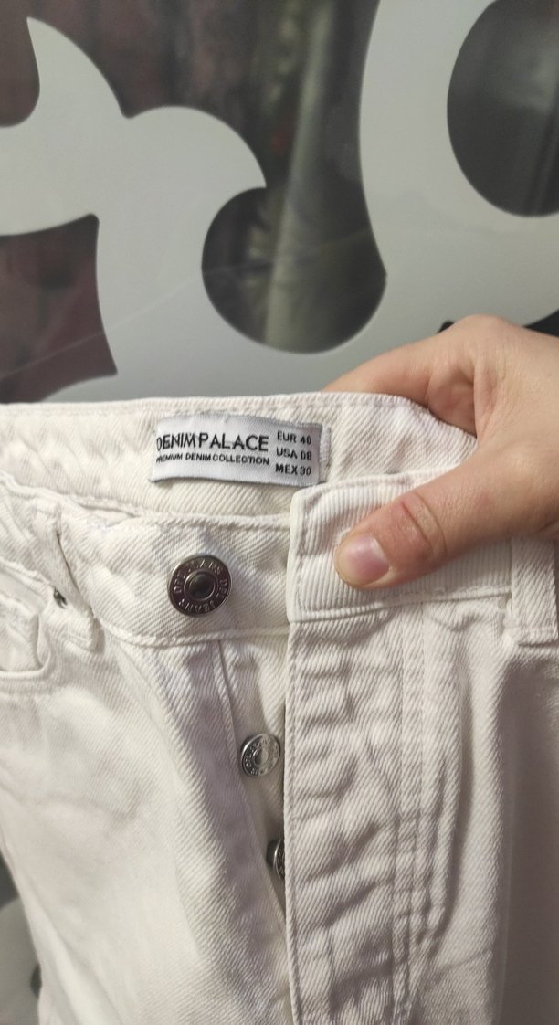 Beyaz renkli, düğmeli ve rahat kesim midi uzunlukta kot pantolon. Baskılı deseniyle gündelik sokak stiline uygundur.