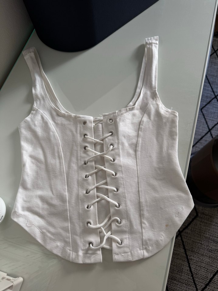 Düğmeli ve bağcıklı ön detaylı, beyaz, ince askılı, dar kesim midi uzunlukta büstiyer. Pürüzsüz sentetik kumaştan üretilmiştir. ✨ kusurlarıyla paylaştım çok rahatsız edici bir leke değil belki çıkar bile fiyatı bu nedenle uygun tutuyorum beden yazmıyor xs uyumlu