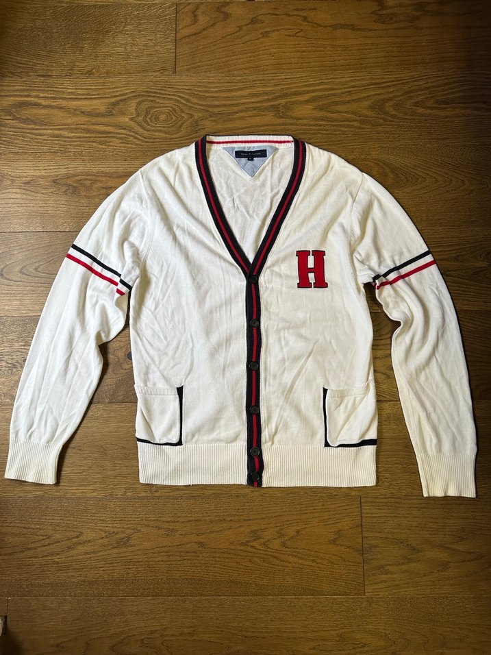 Tommy Hilfiger Beyaz, uzun kollu, düğmeli triko hırka, 'H' işlemeli ve çizgili detaylara sahip. Rahat kesim ve normal boyda, günlük sokak tarzı için uygundur.