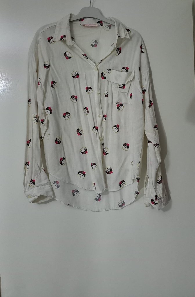 Beyaz, pamuklu, düğmeli, uzun kollu, yakalı, baskılı desenli, rahat kesim kadın gömleği. Günlük sokak stili için uygundur.