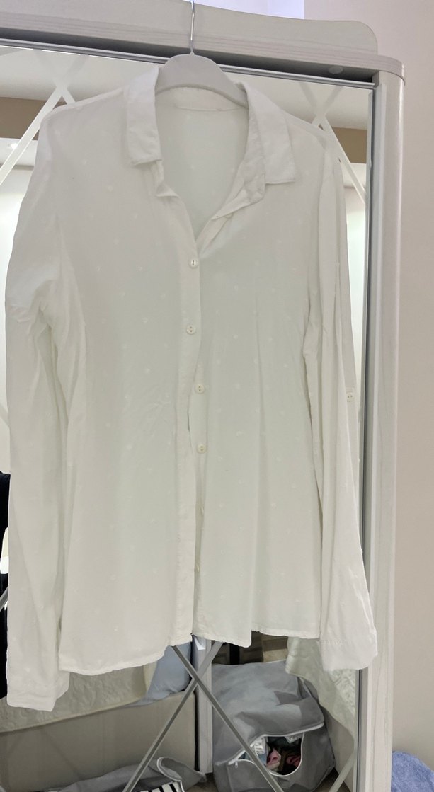 Beyaz düğmeli gömlek, yakalı ve uzun kolludur. Yumuşak keten kumaştan, bol kesim ve normal midi boyda, günlük rahat sokak stiline uygundur.
