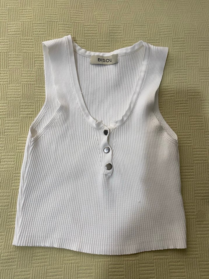 Pamuk kumaştan, düğmeli ve V yakalı beyaz, kolsuz, dar kesim crop atlet.