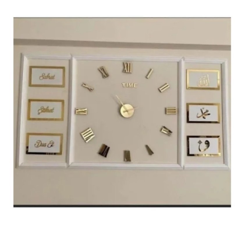 Altın renkli Roma rakamlarına sahip beyaz duvar saati. Ortasında altın renkli bir kadran ve açık renkli zemin bulunur. Klasik saat ve dakika kollarıyla zamanı gösterir ve yaninda 6 li tablosuyla birlikte şık bir goruntüye sahiptir