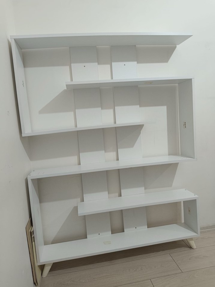 Beyaz duvara monte raflar, düzenli depolama alanı sağlar. Temiz ve açık renk görünümü ile eşyalarınızı düzenli tutar. ️