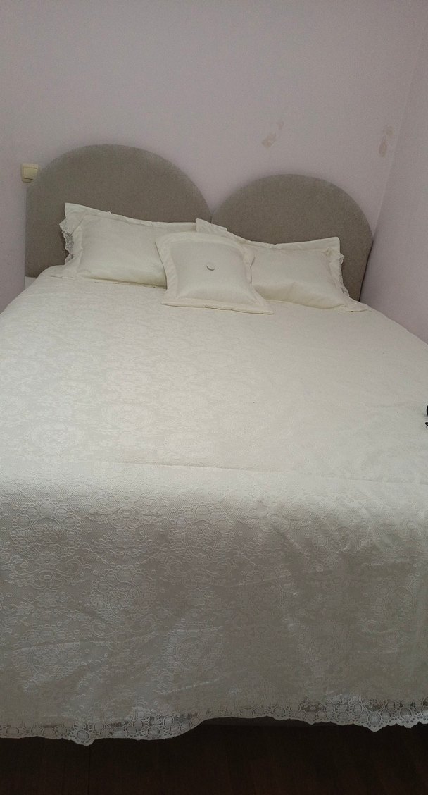 Yatağı düzgünce kaplayan, hafif dokulu beyaz yatak örtüsü. Kenarları zarif yastıklarla birlikte, yatak odasına sıcaklık katıyor. ️