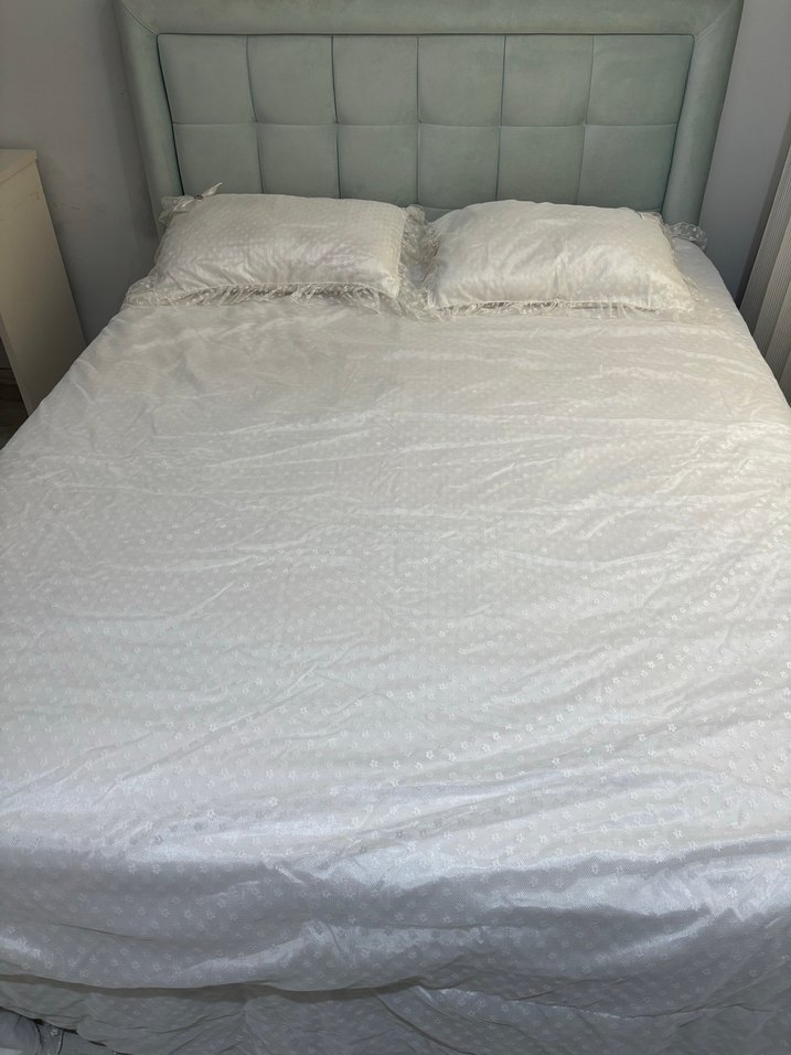 Fırfırlı beyaz yatak örtüsü yastık kılıfında fiyonk detaylar var yastık kılıfında kurdeledeki bir taş yok onun dışına defarmasyon yok yırtık sökük yok hiç kullanılmadı markası elart