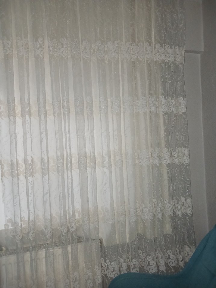 Beyaz renkte, düz desensiz, hafif ve şeffaf yapıda klasik perde. 120 boy 130 en kenardan kesildi dikişle düzeltirile bilir