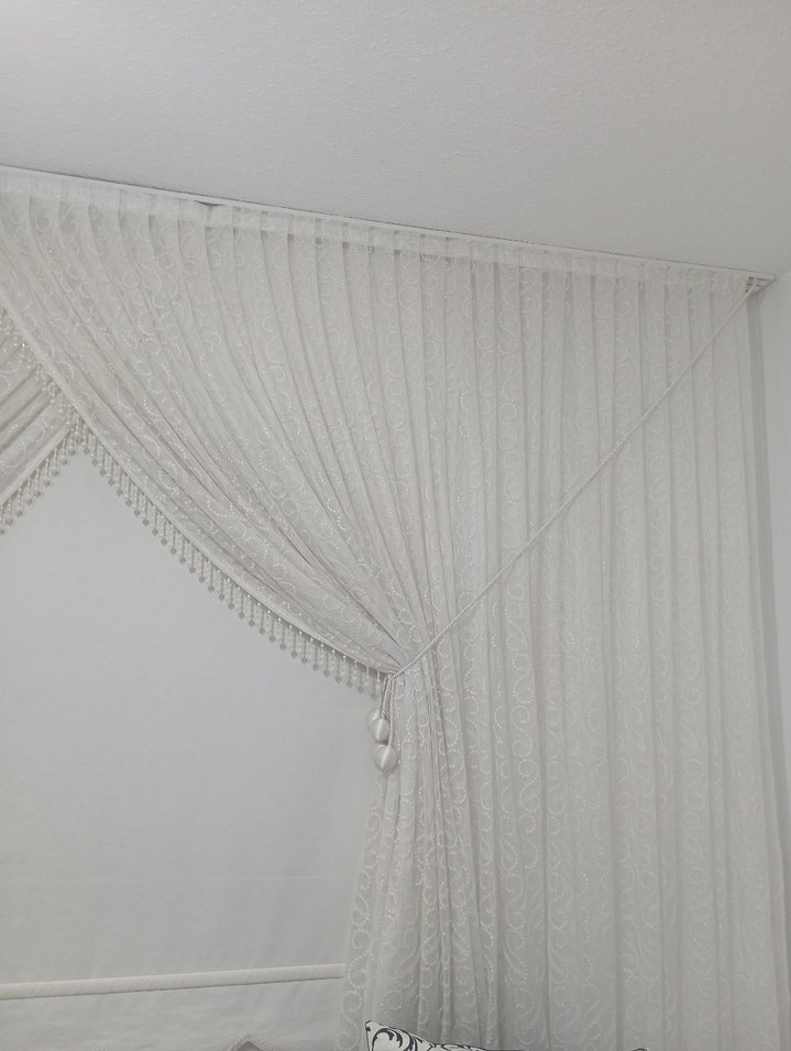 Beyaz düz fon perde, klasik tarzda ve hafif dokulu. Detay olarak süslü püsküller bulunur. halatlari hariç üç buçuk metrelik