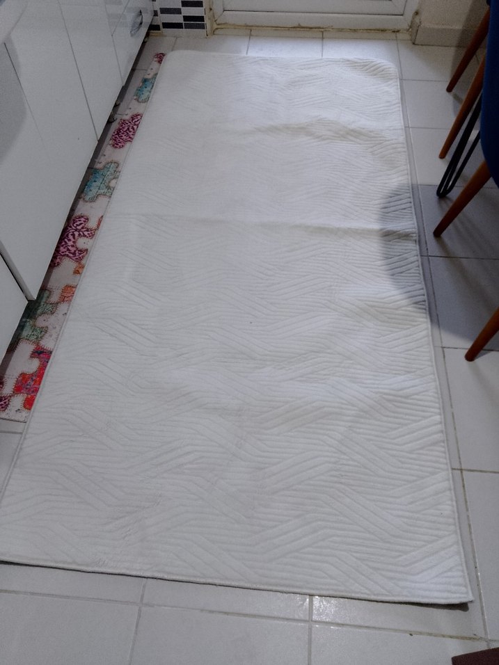 Hafif beyaz renkte, düz ve modern tarzda dokulu halı. Her odaya sade ve temiz bir görünüm katar. en 100 cm uzunluğu 200 cm yanı 2 metre sıfır ürün sadece yıkadım mağazada toz olmuştu