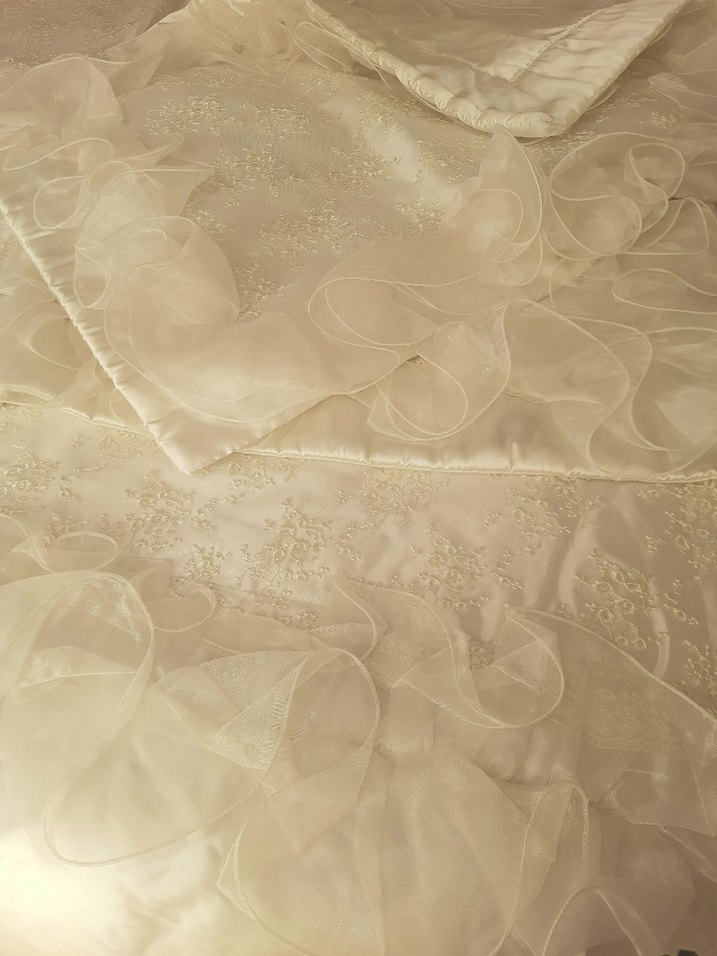 Yumuşak ve pastel tonlarda, düz beyaz renkli yatak örtüsü. Zarif ve akışkan bir dokusu vardır. ️saten dantel tül kenarlar firfirli 2 kılıf az kullanılmıştır çok iyi durumda çantasıyla gonderi olacaktir gelin yatak odası gibi saf beyaz renktir kuru temizleme yapılmamıştır