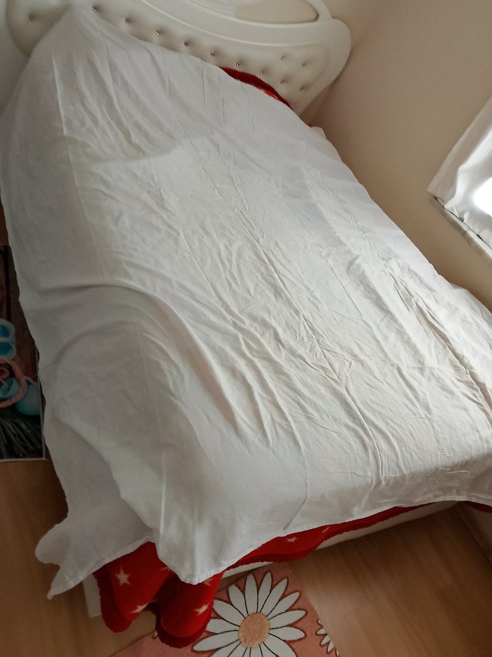 Yumuşak kumaştan yapılmış, temiz ve sade görünümlü beyaz düz renk yatak örtüsü. ️çarşaf